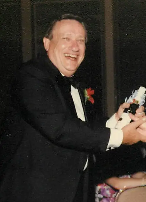 George J. Lavin, Jr. smiling in a tuxedo at a formal event, holding an award or celebratory item